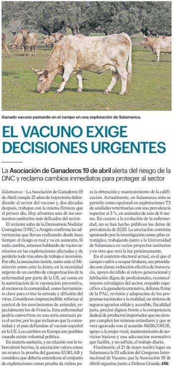 El reciente salto de la Dermatosis Nodular Contagiosa (DNC) a Aragón confirma lo que venimos advirtiendo desde hace tiempo: el riesgo es real y va en aumento. Nos jugamos mucho. Si nada cambia, estamos hablando de vacíos sanitarios en las explotaciones afectadas y de perderlo todo tras años de trabajo e inversión. Por ello, hemos insistido, tanto ante el Ministerio de Agricultura, Pesca y Alimentación, como ante la Junta de Castilla y León, en la necesidad urgente de un cambio de categorización de la enfermedad por parte de la Unión Europea, así como en la autorización de la vacunación preventiva, al menos en nuestra comunidad, como herramienta clave para evitar la entrada y difusión del virus. Del mismo modo, consideramos imprescindible reforzar el control de los movimientos de animales, especialmente, los procedentes de Francia. Esta enfermedad puede ser la sentencia para nuestro sector. No aceptamos que se nos diga que es imposible o excesivamente complejo. Nuestra Comunidad y nuestro país deben solicitar y defender al sector del vacuno español en la UE. Los cambios en Europa son posibles cuando hay voluntad política.