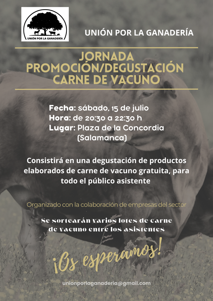 Unión por la Ganadería organiza una jornada de degustación de carne de vacuno que tendrá llugar el próximo sábado, 15 de julio en la plaza de la concordia de Salmanaca a partir de las 2’0:30 horas.