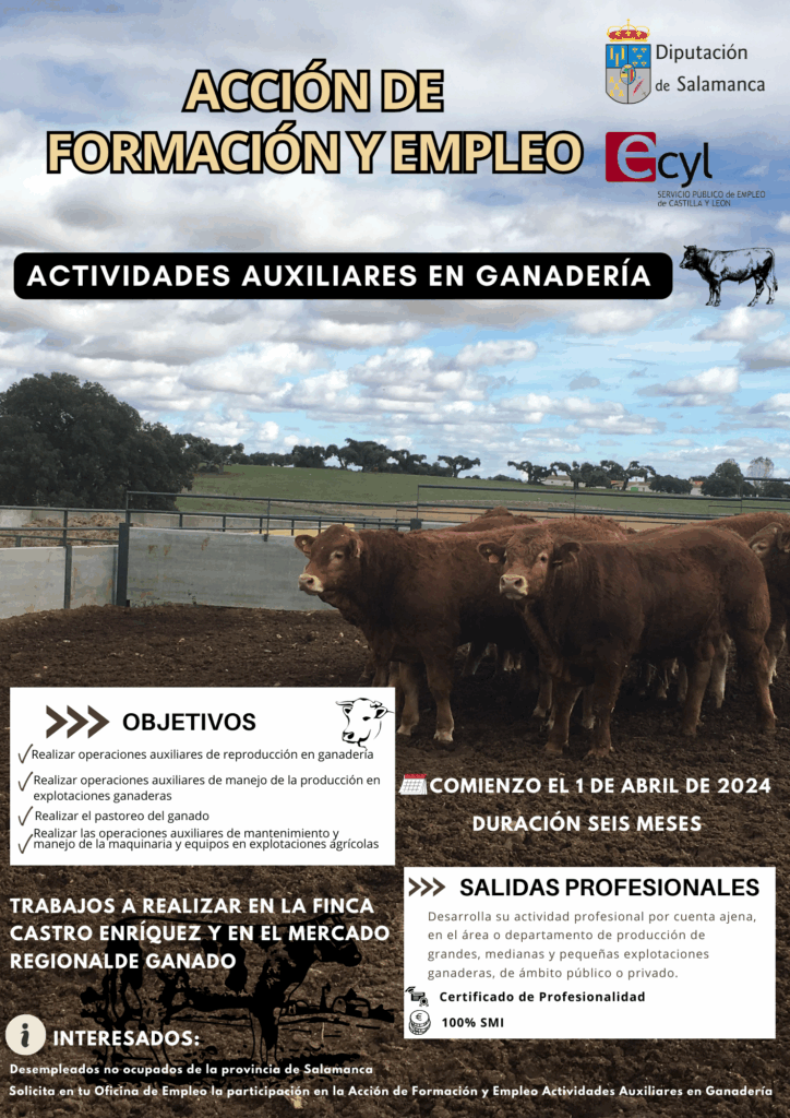 Desde la Diputación de Salamanca nos informan de esta actividad dirigida a desempleados no ocupados de la provincia de Salamanca y que está encaminda a obtener formación en actividades auxiliares a la ganadería. Comenzará el próximo 1 de abril.