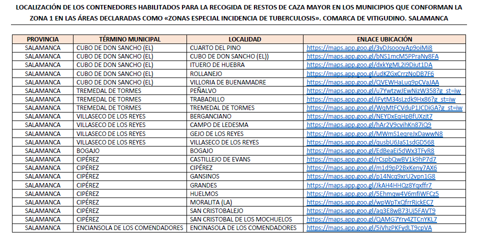 Se han habilitado contenedores para la recogida de restos de caza mayor en los municipios que conforman la Zona 1 en las áreas declaradas como Zona de Especial Incidencia a Tuberculosis (ZEI) en la comarca de Vitigudino.