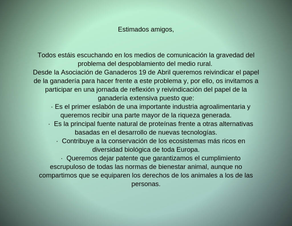 La preocupación por la nueva corriente “animalista” surgida y cada vez más de moda que tanto daño está causando al medio rural, las costumbres, la forma de vida y los sistemas de explotación tradicionales, nos ha llevado a organizar una Jornada que surge con el principal objetivo de informar y poner de manifiesto la importancia y beneficios de nuestros sistemas de explotación, ganadería, medio rural, patrimonio natural y cultural.