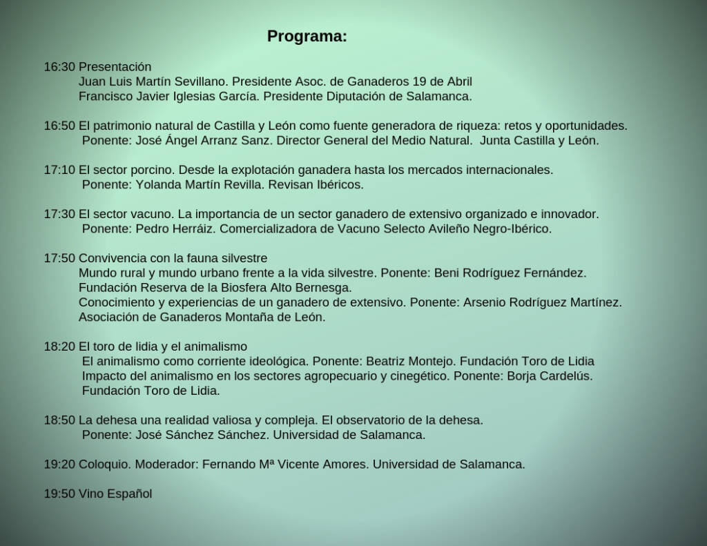 En ella, participarán ponentes de la Dirección General del Medio Natural de la Junta de Castilla y León, del sector porcino (REVISAN), del sector vacuno (Avileño Negro-Ibérico), de la Reserva de la Biosfera, ganaderos de la Montaña de León, de la Fundación del Toro de Lidia, de la Universidad de Salamanca y en el último momento, aunque no figura en el programa, se ha incorporado una delegación de empresarios Chinos importadores de productos agroalimentarios que hablaran sobre las posibilidades de exportación a China.