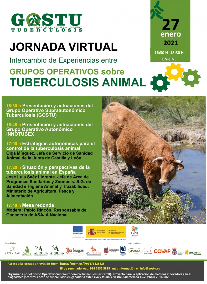 El próximo 27 de enero promovemos una jornada online en la que intercambiar experiencias entre Grupos Operativos que actúan en el ámbito de la tuberculosis animal para ello contara con la presencia del grupo Innotubex, Olga Minguez Jefa de Sanidad Animal de Castilla y León y Jose Luis Saéz LLorente del Ministerio de Agricultura , Pesca y Alimentación.