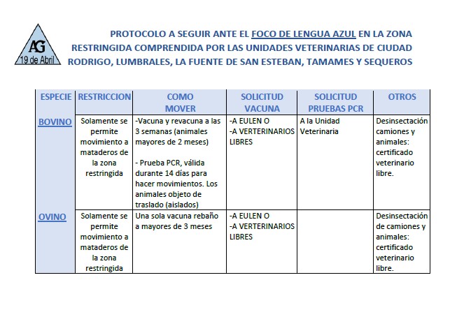 En la reunión mantenida en la tarde ade ayer con responsables de la Junta De Castilla y León y la Consejería, se facilitó información y un protolo de de actuación ante el foco de Lengua Azul declarado en Ciudad Rodrigo el pasado viernes.