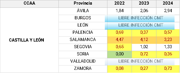 La evolución en Zamora también preocupa. En 2023 la mayoría de comarcas registraban prevalencias del 0% y se encontraba en proceso para ser declarada provincia oficialmente indemne. Sin embargo, en 2024 ya tres comarcas presentan datos preocupantes: Bermillo de Sayago (1,72%), Puebla de Sanabria (1,56%) y Zamora (0,54%).