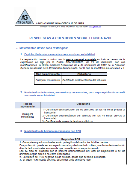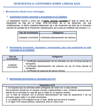 Estos son los requisitos obligatorios para realizar movimientos desde la zona restringida de Lengua Azul dependiendo de la situación de la explotación y de los animales objeto de traslado.