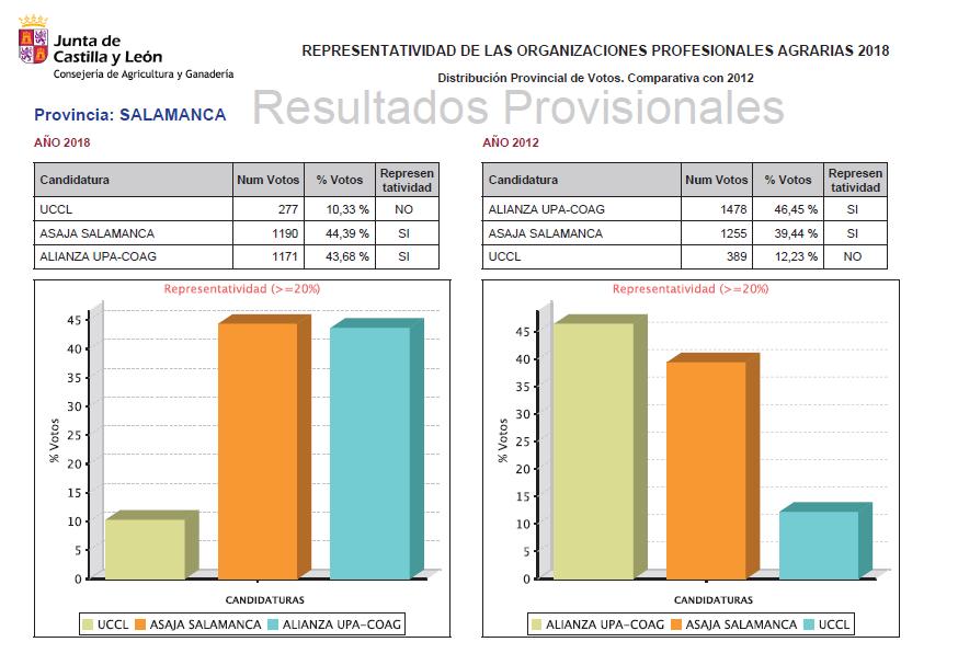 El día 11 de febrero se han celebrado en Castilla y León elecciones agrarias . La participación en la Comunidad y los resultados obtenidos en la provincia de Salamanca se pueden ver en los siguientes gráficos. Más información en: https://agriculturaganaderia.jcyl.es/web/jcyl/AgriculturaGanaderia/es/Plantilla100/1284754378340/_/_/_