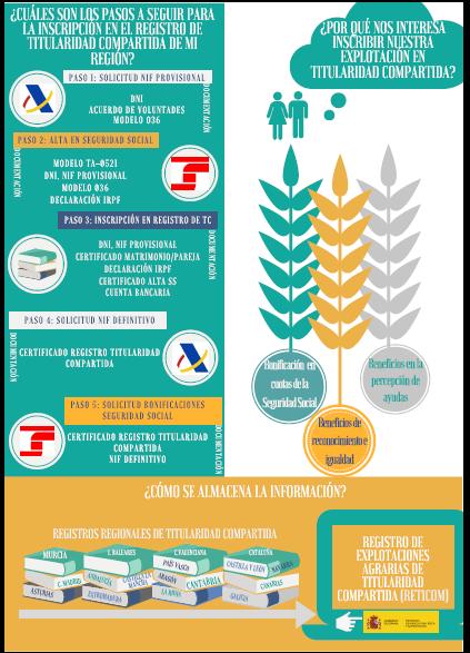 También se busca facilitar el registro en la Titularidad Compartida, identificando el procedimiento de registro con un enfoque preciso para cada Comunidad Autónoma. En el Manual se encuentran también las respuestas a dudas frecuentes que surgen en relación con dicha figura, sus implicaciones tanto fiscales como en materia de Seguridad Social, el proceso de registro, compatibilidades con otras actividades o ayudas, al Pago Básico y el reconocimiento de la explotación como prioritaria.
